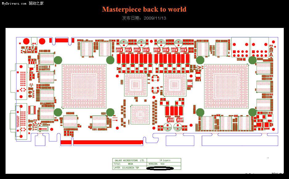 遗憾的是,影驰只给了一张显卡PCB设计布局图,并没有额外的只言片语。图片下方标注着“14 layers”字样,也就是采用14层PCB,而这种罕见的奢侈设计只会出现在最高端显卡上。
