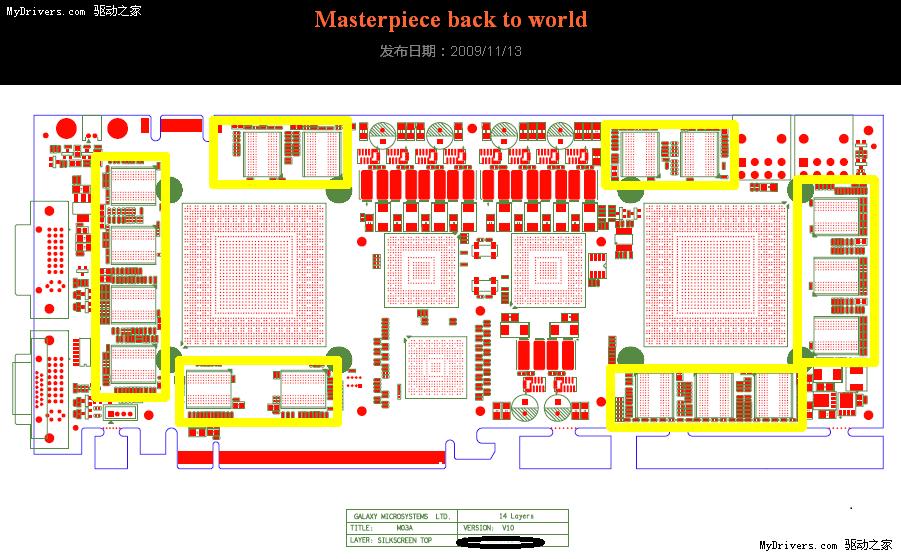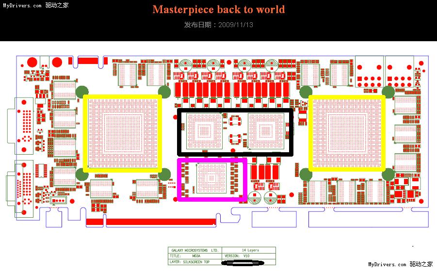 从布局图上看,这是一个很明显的单卡双芯产品,左右两颗巨大的GPU核心(黄色),中间两个NVIO视频输出芯片(黑色)和一个桥接芯片(粉色),周围环绕着16颗显存芯片(黄色)。