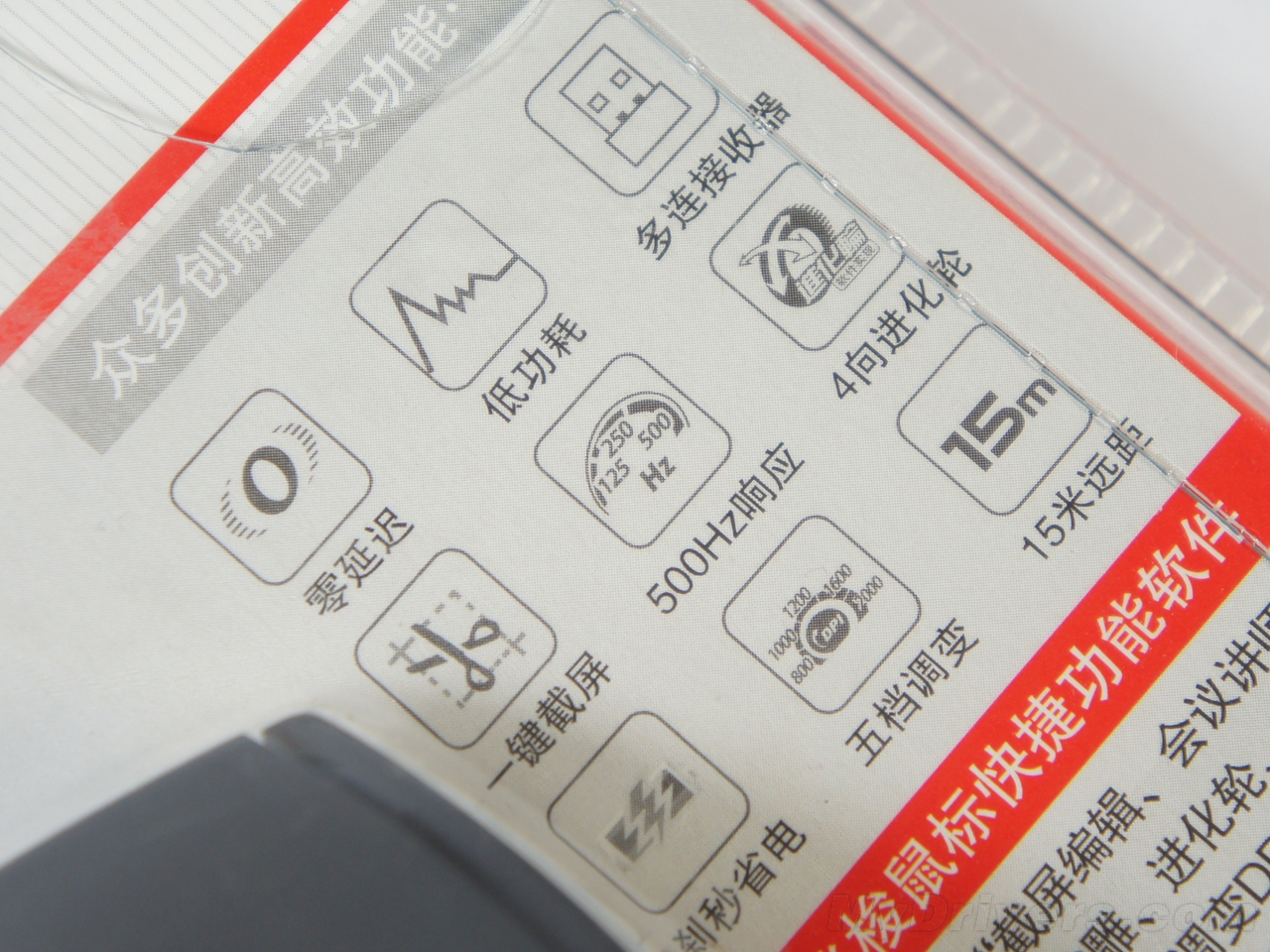 特色功能介绍,包括零延迟、低功耗、多连接收器、一键16雕、500Hz相应、4向进化轮、刹秒省电、五档调变、15米远距离传输等等,这些都和之前的无孔鼠完全一样。